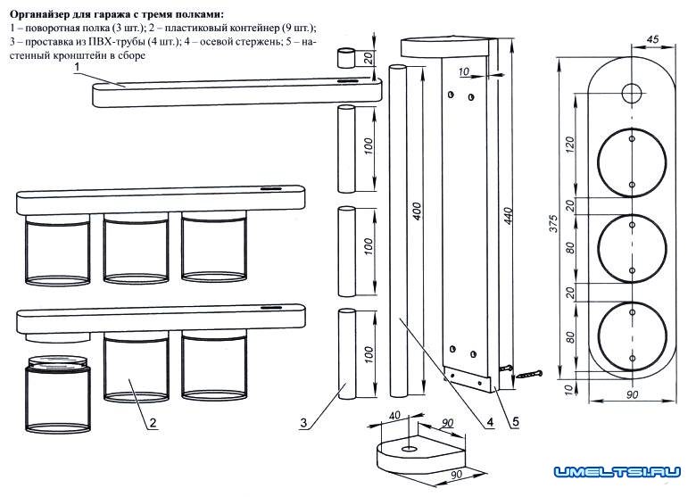 Работы по проектированию начинаем с определения количества контейнеров и, соответственно, количества и длины полок. На приведенных чертежах показан 9-6аночный вариант органайзера с тремя полками. При необходимости емкость хранилища можно легко увеличить. Однако не рекомендуем размещать в один ряд более четырех контейнеров: чем больше рычаг, тем выше нагрузка на узел крепления, да и на компактности это скажется негативно. Зато количеством полок можно поварьировать, доведя их до пятичиести. Но оптимально все-таки, чтобы они оставались в пределах доступа вытянутой руки и были перед глазами. А выбирая материал (доски или фанеру), учитывайте, что его толщина должна быть достаточно большой, не менее 20 мм. Иначе полки через некоторое время под нагрузкой могут изогнуться.