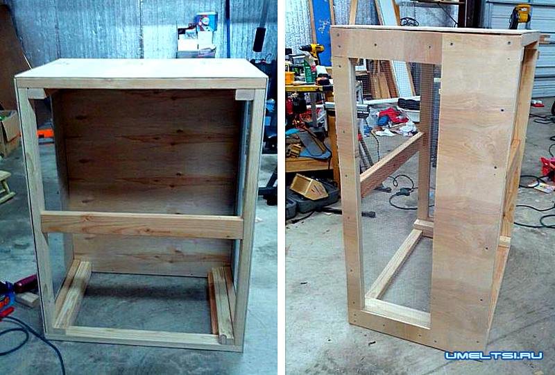 Рама собирается в достаточно простой способ. Взяв брусья, нужно сформировать так называемые квадраты, которые служат боковыми частями, и закрутить их, используя саморезы. Затем нужно взять более длинные рейки-брусья, и соединить квадраты один с другим. После этого маленькими гвоздиками следует прикрепить толстый лист фанеры, вырезать лист фанеры на боковые стороны (нужна половина, для хорошего обзора), установить перемычку из доски, чтобы на нее установить петли, которые позволят открыть и закрыть дверь.