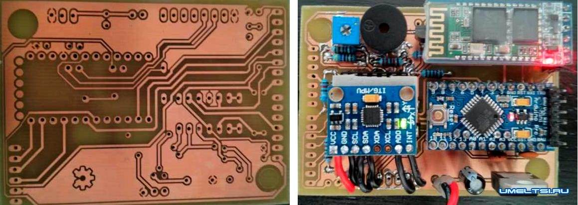 Внизу – изображение с готовой печатной платой и принципиальной схемой. MPU-6050 фиксируется с помощью двойной клейкой ленты, чтобы минимизировать вибрации.