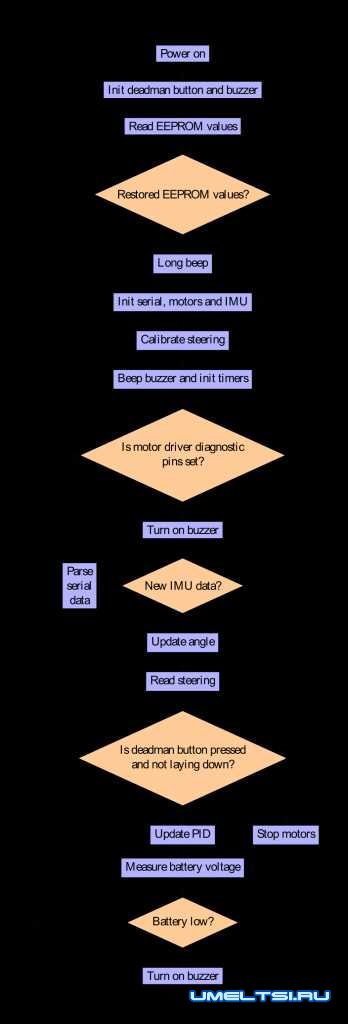 Чтобы понимать архитектуру, которая используется в программе, можно ориентироваться на блок-схему внизу. Она описывает рабочий алгоритм электронной системы управления.