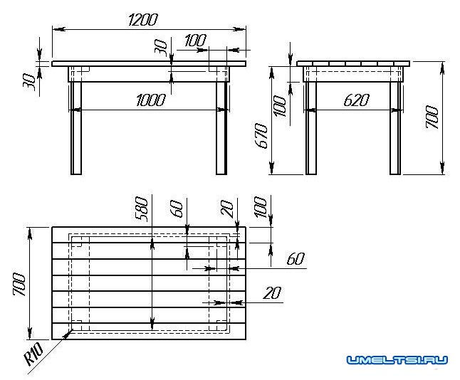 В данном случае согласно чертежам стол отличается такими проектными размерами: 300х600х300 мм. Но каждый может определить для себя более удобные для него параметры.