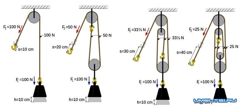 На изображениях можно увидеть, что с использованием полиспастных механизмов нагрузка на барабан снижается в 4 раза.