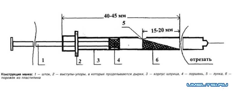 • С обратной стороны, до самого поршня, нужно затолкнуть пластилин, разравниваем его с помощью расплющенной на конце иголки, и формируем на одном его конце скошенный порожек, чтобы воздух свободно проходил к отверстию лунки.