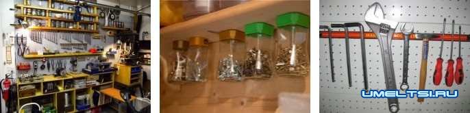 Поскольку гараж подходит для разной работы, следует условно разделить его на рабочие зоны. Для этого будет полезным провести генеральную уборку и выбросить ненужные вещи. Мастерская зона – в гараже незаменима. Здесь пригодится верстак, а над рабочим местом будут полезны полки с инструментом и готовыми поделками. Для хранения дюбелей и других мелких предметов лучше взять прозрачные баночки, прикрепленные крышкой к полке. С магнитной полосой, наклеенной на мебель, вы сэкономите немало места.