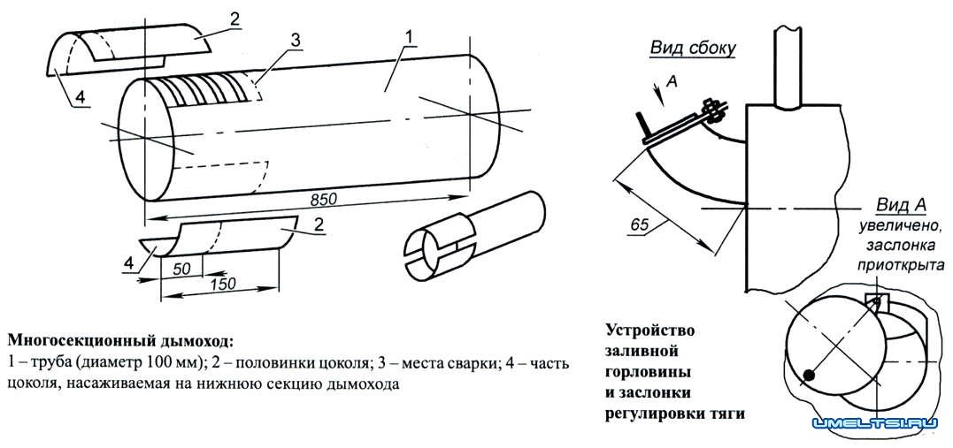 Сверху дымоход венчает обычный покупной «грибок» из оцинкованной стали. К трубам приварены ручки из арматуры, чтобы дымоход было удобнее собирать. А снизу к топке (она же камера сгорания) приварены ножки, я использовал в этом качестве толстые болты. В целом, конструкция печи несложная и понятна из приводимого чертежа, поэтому перейдем к тому, как она работает и как с ней следует грамотно обращаться.