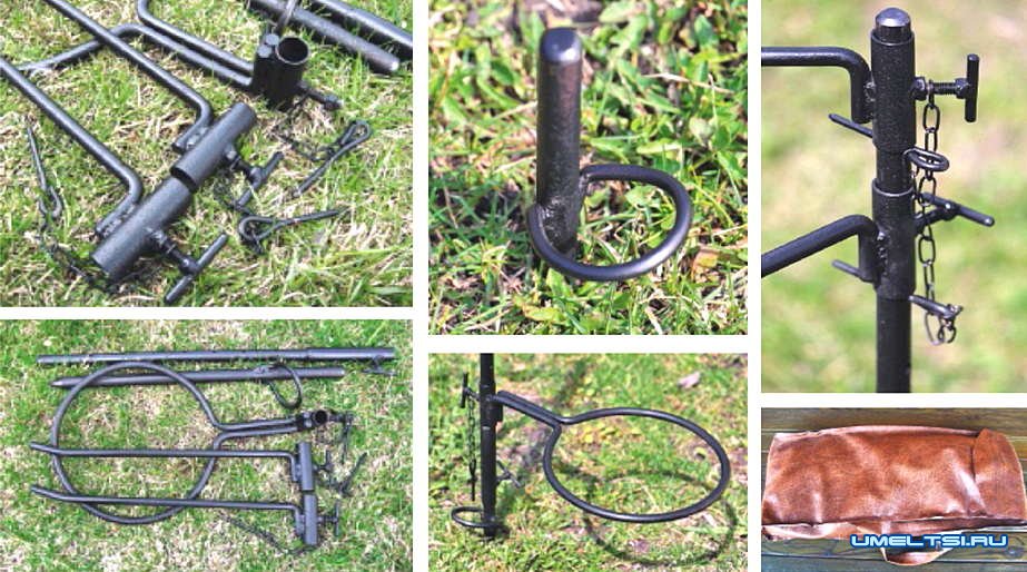 Сковородник и крючки котелков выгнул из стального прутка диаметром 12 мм. Затем приварил их к подвижным втулкам из трубы с внутренним диаметром 20,5 мм.
