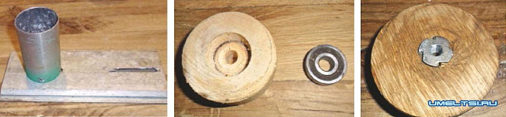 Затем из деревянного бруска необходимо изготовить цилиндр, внешний диаметр которого соответствовал бы внутреннему диаметру трубы. В деревянном цилиндре делаем отверстие под вал (наша резьбовая шпилька М8) и протачиваем выемку под шарикоподшипник.
