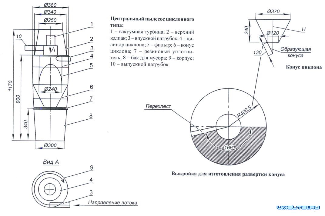 Далее из оцинкованного листа толщиной примерно в 0,5 мм сделал конус для циклонной части. Тут пришлось немного повозиться и даже вспомнить школьный курс геометрии, чтобы правильно рассчитать развертку усеченного конуса. В моем случае диаметр верхнего основания конуса равен 370 мм, а нижнего отверстия - 120 мм. Высота конуса составляет 240 мм. Тогда его полная высота Н (если бы он был не усеченный) рассчитывается из равенства пропорций сторон подобных треугольников: