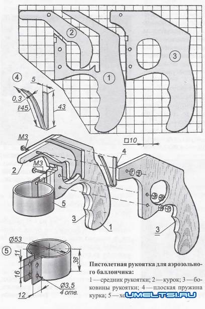 Подобно стрелковому оружию, которое легко разбирается и собирается, пистолетную рукоятку также можно быстро разделить на составляющие, а значит и без особых сложностей собрать себе это полезное приспособление. Из металла в нём только две детали: жестяной хомут и стальная плоская пружинка для курка. Остальное элементы можно выпилить лобзиком из листа фанеры толщиной 5 мм.