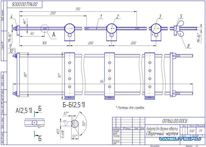 На нем конструкция самого устройства. Его главные составляющие две направляющие линейки соединенный между собой крепежом со специальной ланкой (соединительной). На самой планке имеются несколько отверстий, именно благодаря этому на нее можно устанавливать планку для деталей, имеющих различную ширину. Сменные корпуса и набор направляющих втулок, которые имеют разные расстояния друг между другом, перемещаются по линейкам. Кондуктор фиксируется благодаря соединительной планке. Ограничитель хода фиксирует его с противоположной стороны. Барашковый винт поджимает ограничитель хода.