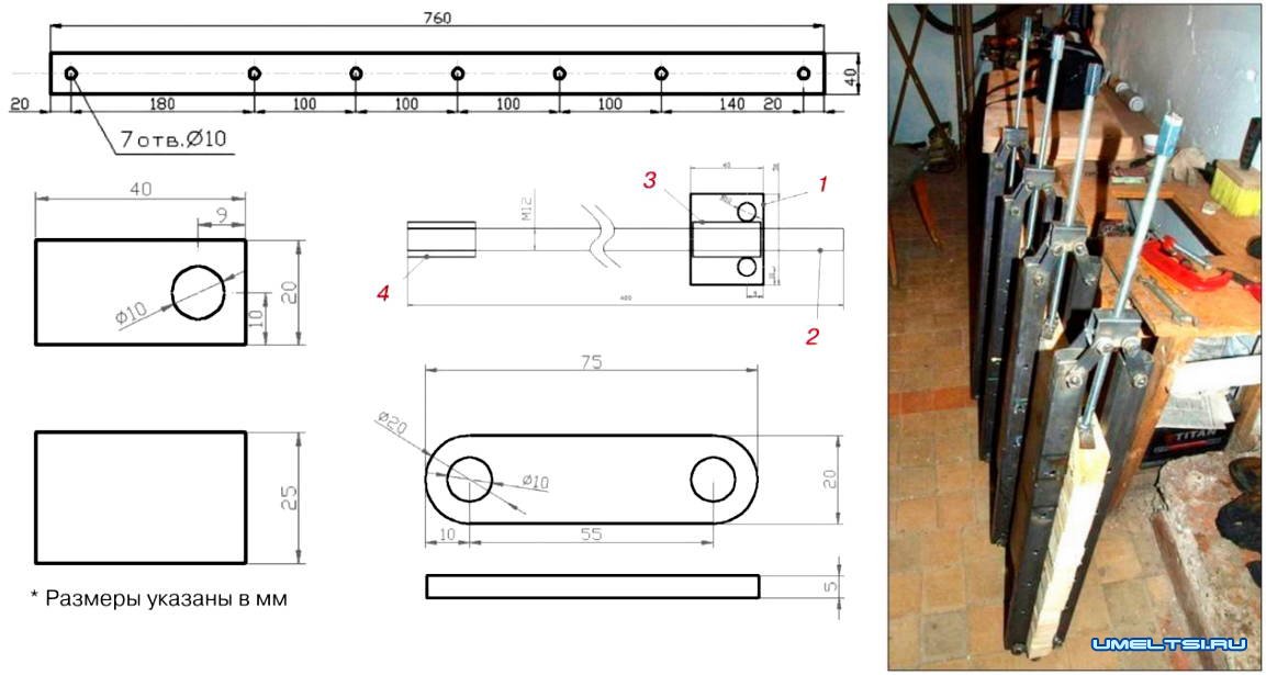 Понадобилось: труба сечением 40x25 мм, металлическая пластина сечением 20x5 мм, резьбовая шпилька М 12, удлиненные гайки М 12, болты и гайки М 10.