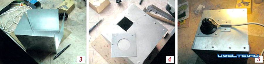 2. Сначала, используя резиновую киянку, загнул на 90 град, две противоположные стенки кожуха и находящиеся с ними в одной плоскости кромки (фото 2) Затем, придерживая заготовку изнутри обрезком дощечки с ровным краем, подогнул оставшиеся две стенки. Лепестки направил внутрь (фото 3).