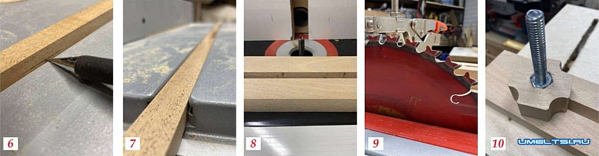 Чтобы площадка на столе станка не смещалась в стороны относительно пилы, снизу прикрутил направляющую (фото 4). Для этого подобрал брусок сечением по ширине паза на столе станка (фото 5). Он был немного больше глубины, по месту выполнил разметку и обрезал лишнее (фото 6, 7).