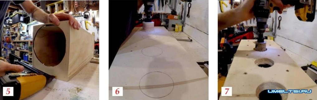 Сверху в коробе наметил и высверлил насадкой-коронкой отверстия под трубы (фото 6), а чтобы последние не провалились внутрь, закрепил изнутри планку из тонкой фанеры и в ней просверлил отверстия чуть меньшего диаметра (фото 7)