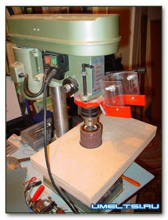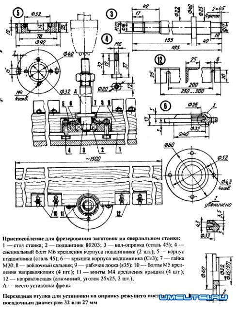Режущий инструмент при помощи колец и шайб устанавливают на необходимой высоте над буртиком и, подложив сверху еще кольцо либо шайбу, затягивают детали гайкой М20. Для получения нужной поверхности заготовки а также различные фрезы: дисковые, цилиндрические, фасонные. Чтобы на оправку можно было установить режущий инструмент с посадочным диаметром 27 или 32 мм, необходимо выточить переходные втулки.Для удобства обработки длинномерных заготовок на столе сверлильного станка смонтирована рабочая доска длиной около 1500 и шириной 300 мм. Толщина доски выбрана такой, чтобы ее верх немного возвышался над защитным буртиком. В нашем варианте данный размер составил 35 мм. В срединной области доски с одной ее стороны выполнена полукруглая выборка под корпус подшипника и буртик оправки. На столе станка доска закрепляется 2-мя болтами М6 с утопленными в ее тело головками.