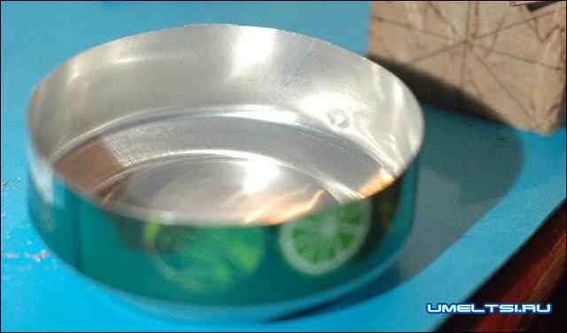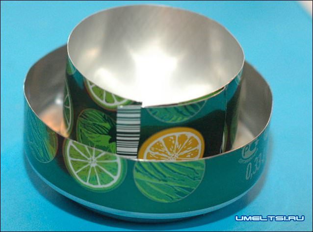Следующий ход такой: берем баночку, выставляем ее на стол, а далее плотно прижимаем ее к лезвию и крутим ее. Достаточно будет сделать не более пятнадцати оборотов. После этого дно легко отделиться от верхней части баночки. Отрезанная часть и будет служить дном будущей горелки. В эту часть будем далее вставлять верх. Исходя из этого, сверху вставляем вторую нашу баночку (пока еще целую). Что бы легко входила верхняя часть, ее нужно чуть растянуть. Вставляем ее предельно аккуратно, чтобы в будущем можно легко разобрать нашу конструкцию. Достаточная глубина около семи миллиметров.