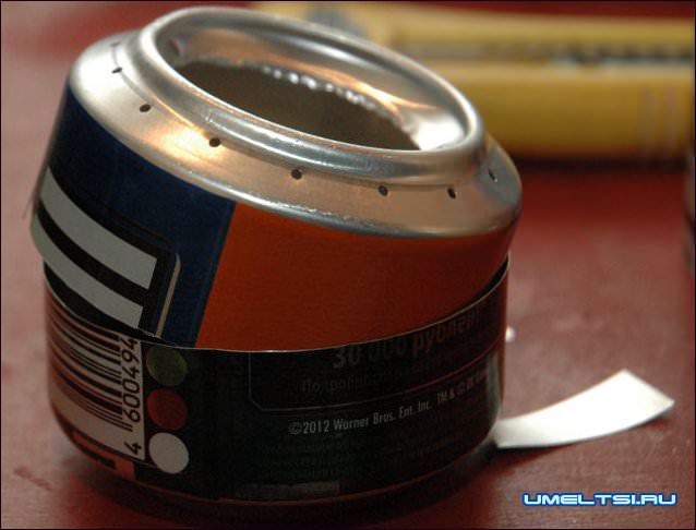 В нижней части проделываем несколько вырезов в форме треугольников, высота которых должна быть примерно три миллиметра. Эти вырезы необходимы для того, чтобы наше горючее затекало во внутрь горелки.