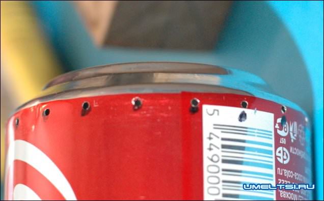 Проделав все эти действия, начинаем изготавливать будущую верхнюю часть. Если вы не освободили ранее, освобождаем сейчас содержимое второй баночки. После опустошения, просверливаем по всему периметру отверстия. Для большого эффекта используйте более тонкое сверло.