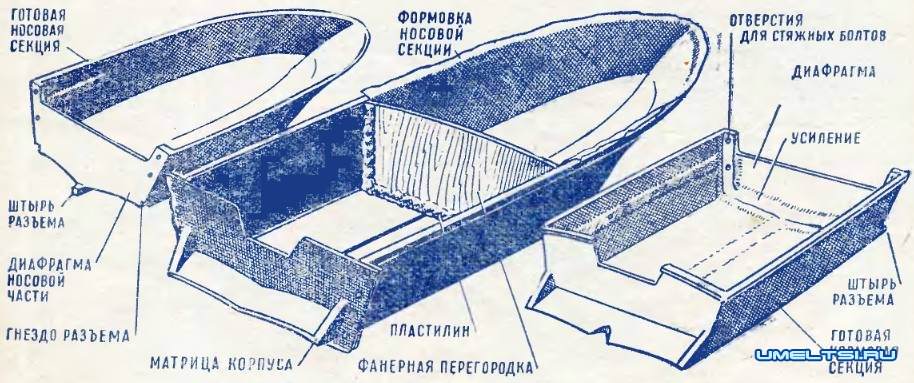 В персом случае (деревянный вариант) корпус строится, как обычно, целиком, но после обшивки фанерой аккуратно распиливается на предусмотренное количество секций, а затем выполняется заделка диафрагм, оклейка стеклотканью (или хлопчатобумажной бязью) и монтаж болтового соединения.