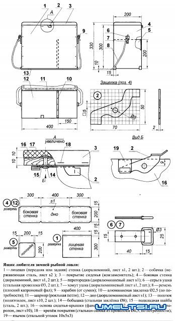 Ремень для ящика — из плоского капронового фала. Один его конец заводится в ушко и скрепляется с лентой ремня заклёпкой. На другой конец таким же образом подвешивамой взгляд, наиболее прочным, и его можно рекомендовать рыболовам-тяжеловесам. Сиденье у него жёстко прикреплено к трём стенкам (обеим лицевым и одной — боковой), а крышка — отдельная и прикрывает скошенную часть ящика.