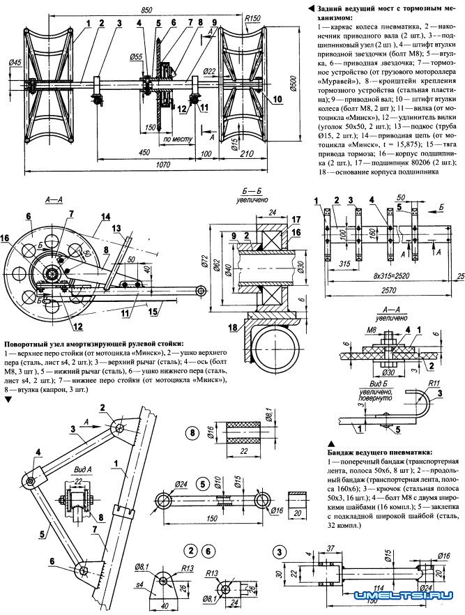 Пневматики представляют собой камеры от колес тракторной тележки, надетые на каркасные диски и «обутые» в бандажи из транспортерных лент Поперечный и продольный бандажи скреплены болтами, высокие выступающие стержни которых служат грунто-зацепами.