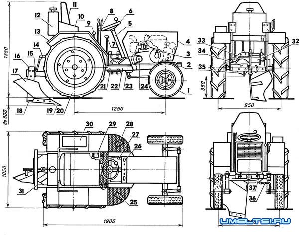 Мини-трактор (светооборудование условно не показано): 1 — колесо переднее ведомое с пневматической шиной 5,0—10" (2 шт.), 2 — трапеция рулевая (от мотоколяски СЗА), 3 — агрегат силовой (от мотоколяски СЗА), 4 — капот поворотный самодельный, 5 — колонка рулевая (от автомобиля ГАЗ-21 «Волга»), 6 — колесо рулевое с рукояткой «шар» (от погрузчика), 7 — рычаг «реверс», 8 — рычаг подъема навесной рамы (с фиксацией, от автобуса ЛиАЗ), 9 — рычаги (правый и левый) включения тормозов, 10 — кронштейн бензобака (2 шт.), 11 — сиденье, 12 — бензобак, 13 — крыло пылегрязезащитное (2 шт.), 14 — механизм подъема навесной рамы (рычажный), 15 — плита установки навесных орудий, 16 — корпус плуга, 17 — отвал, 18 — доска полевая, 19 — лемех с удлиненным носком, 20 — колесо заднее ведущее с пневматической шиной 6,5—20" (2 шт.), 21 — реверс-редуктор самодельный (описание и эскизы конструкции см. в № 1Г89), 22 — рама МТ, 23 — механизм рулевой (от автомобиля ГАЗ-21 «Волга»), 24 — передача силовая с цепью ПР-19,05 (от списанной сельхозтехники), 25 — педаль «сцепление», 26 — щиток приборный, 27 — рычаг кикстартера, 28 — педаль «газ», 29 — цилиндр гидропривода тормозов главный, 30 — ящик с инструментом, 31 —рама навесная, 32 — опора приварная механизма подъема навесной рамы, 33 — полик, 34 — устройство буксирное, 35 — мост задний (от автомобиля ГАЗ-21 «Волга», укороченный), 36 — сошка рулевая, 37 — кронштейн реверс-редуктора.