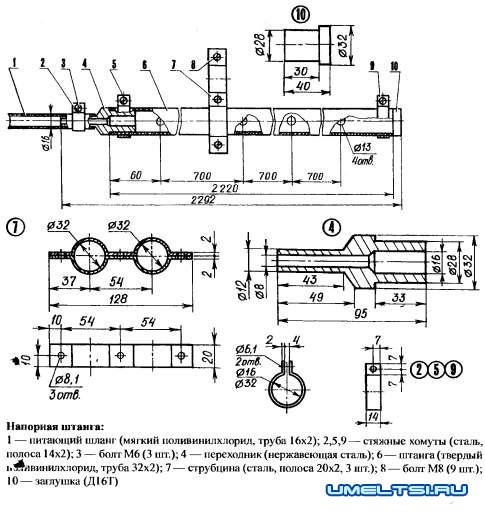 Напорная штанга представляет собой пластмассовую трубу диаметром 32 мм, которая тремя струбцинами притянута к траверсе шарнирной рамки. Левый (по ходу трактора) конец штанги закрыт дюралюминиевой заглушкой, а правый — через переходник соединен с питающим шлангом. Хомуты на концах штанги служат для уплотнения соединений и не позволяют раствору просачиваться наружу.