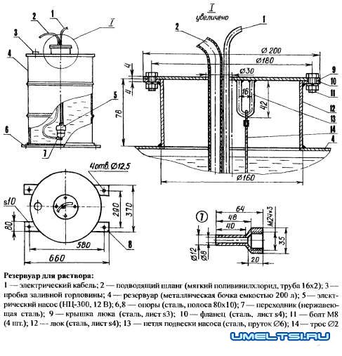 На верху бочки — люк, а внизу — две пластинчатые опоры для установки на раме опрыскивателя. Через люк в резервуар введен насос и подвешен там на тонком тросе (от сцепления мотоцикла) к специально приваренной скобе.