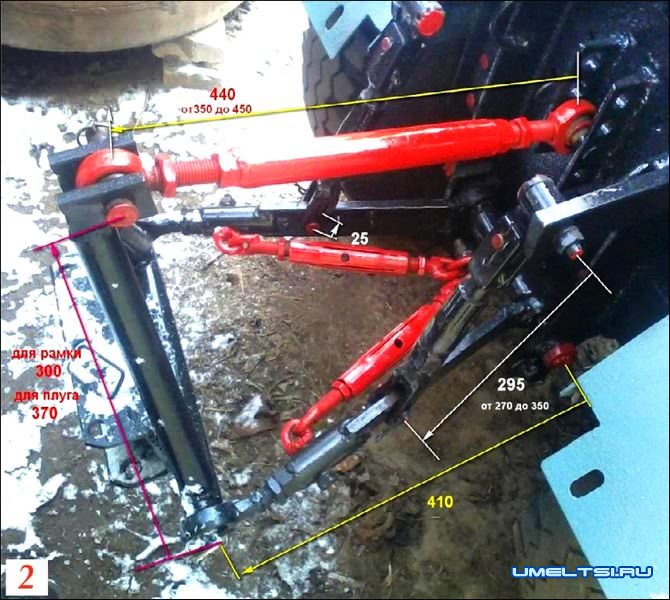 Привод НШ осуществляется от коленвала двигателя при помощи ремня Б-800. Для подъема навески (фото 2), на которую устанавливаю навесное оборудование, использовал гидроцилиндры 40/20/160.
