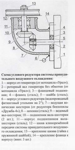 Цилиндры двигателя оборудованы принудительным воздушным охлаждением. Поначалу оно осуществлялось от одного центрального (общего) вентилятора, но оказалось не столь уж эффективным. А потому его модернизировал, снабдив каждый цилиндр своей крыльчаткой. Привод вентилятора сделал от вала переделанного штатного «ураловского» генератора через угловой редуктор, корпусом которого послужил водопроводный фитинговый двухдюймовый угольник. Шестерни для углового редуктора взяты от соответствующего узла бензопилы «Дружба-4». От одной шестерни-вала отрезал концевик, просверлил и проточил в ней отверстие под диаметр вала ротора генератора, насадил и приварил. Другой вал-шестерню в сборе с подшипниками и обоймой установил в корпус углового редуктора с другой стороны. На выходной вал этого редуктора насажен шкив, с которого вращение через клиноременную передачу передается на шкивы двух вентиляторов, находящихся сверху каждого цилиндра. Обоймы подшипников-вентиляторов приварены к рамке капота. Шкивы — от стиральной машины, а вентиляторы — от радиатора отопителя автомобиля УАЗ-469.