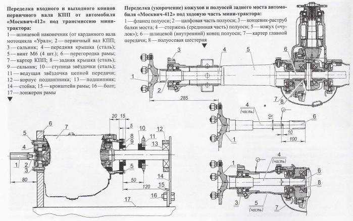У коробки передач от «Москви-ча-412» к выступающему концу первичного вала для его подсоединения к силовому агрегату приваривается шлицевой конец карданного вала от мотоцикла «Урал». Длина выступающей части состыкованного первичного вала равна 80 мм. Но перед этим стыкуемые торцы валов дорабатываются. На одном выполняется шип, а на другом прорезается соответствующий паз. Отверстие в картере коробки прикрыто самодельной крышкой с сальником, прикрученной к картеру четырьмя винтами Мб.
