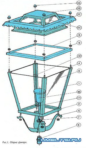 Рамку 12 делают из листа; по краю с помощью просечек оформляют узорчатую кайму-подзор, придающую фонарю нарядный вид. После этого кромки отгибают под углом до 60° так, что вблизи углов образуются плавные волны; вырезают квадратное отверстие размером 185x185 мм, в которое впоследствии вставляют и закрепляют пайкой венчающий фонарь плафон в форме усеченной пирамиды.