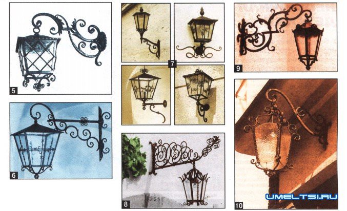 Кованые фонари и светильники использовали с древних времен.На Руси их называли светцами, подсвечниками и шандалами. С точки зрения мастера существует неограниченное количество вариантов для изготовления удобного и высокохудожественного изделия. Тем более, что по конструкции такие изделия могут сильно отличаться в зависимости от места ик расположения или способа крепления. Например, на стене — они могут быть подвесными (фото 1-6) или в форме бра (фото 7), а около входа в дом в портале — без колпака (фото 6, 10). Более массивные и крупные фонари используют на отдельностоящих столбах или в канделябрах (фото 11). Фонари на столбах высвечивают красоту зданий и прилегающих к ним территорий. Они всегда оказываются в поле нашего зрения потому, что цель установки таких светильников не только утилитарная — освещать нужный участок, но и декоративная.