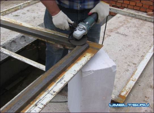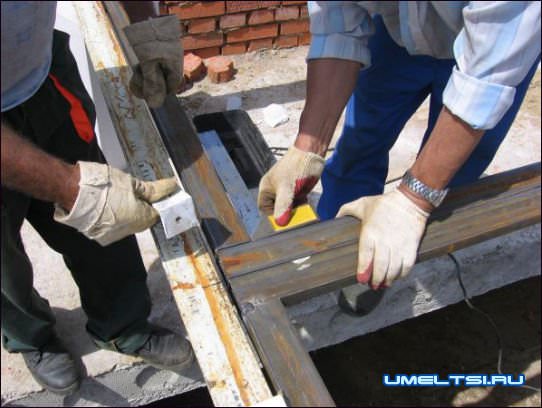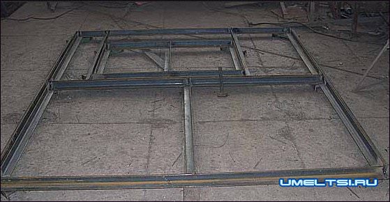 Подготовленные по требуемому размеру и обрезанные по концам под намеченным углом, уголки укладываются по контуру будущего проема ворот. Для того, чтобы это правильно сделать, организуется монтажная площадка. Она должна представлять собой ровную, по горизонту, поверхность с асфальтовым, или с бетонным покрытием. Если такой поверхности нет, можно использовать для монтажной основы бетонные блоки.