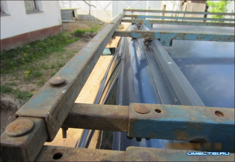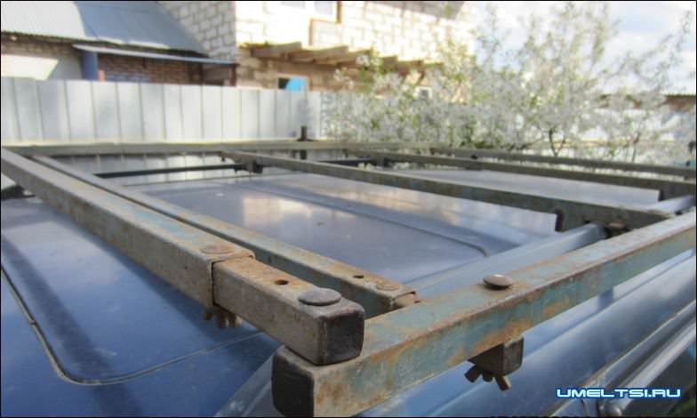 Вдоль краев основы укладываются трубы 25х25 и оптимальной длины 170 сантиметров. Внутрь каждой трубы вставляется труба 20х20 тоже длиной 170 сантиметров. Далее останется просверлить все трубы на концах и скрепить болтами. Торцы труб обязательно замазываются авто пластилином, чтобы внутрь не попадала грязь и трубы не проржавели. Покрасить багажник можно в тон самой машины.
