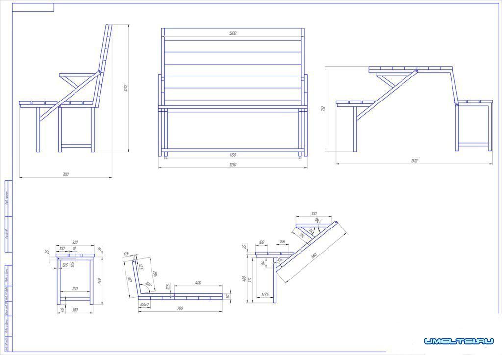Трансформер в положении «скамейка». Планки спинки и сидений покрыл лаком в два слоя, что делает их стойкими к осадкам, увеличивая срок эксплуатации.