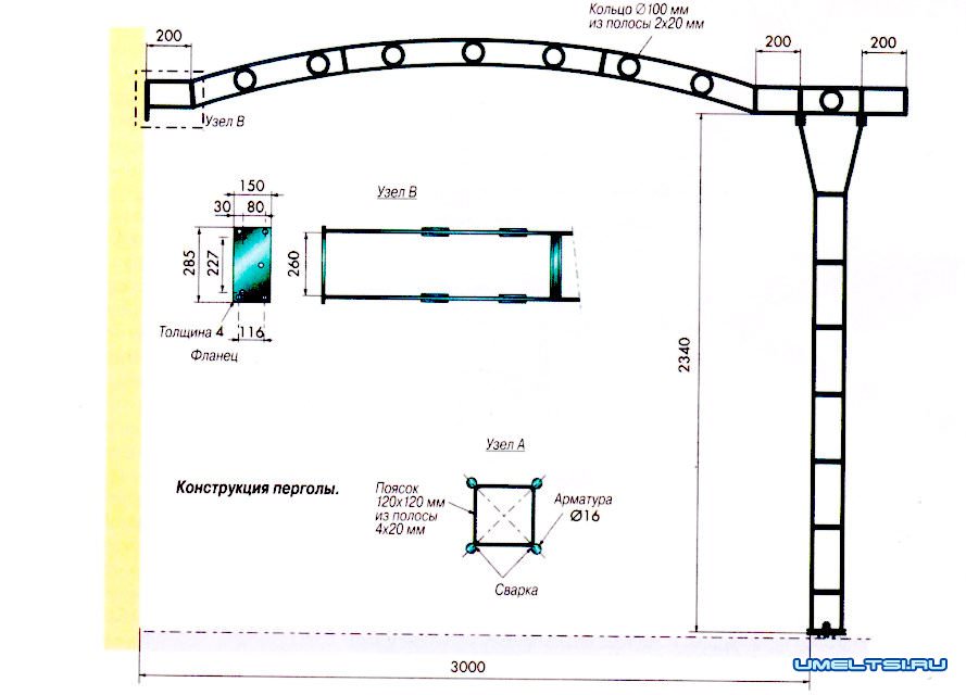 Подготовленные металлические конструкции перед монтажом очищают от ржавчины, окалины, грунтуют, а затем красят. Конструкция и узлы перголы — на рисунках.