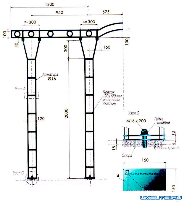 Каждая стойка сварена из четырёх арматурных прутков ⌀16 мм с помощью поясков 120x120 мм, согнутых из стальной полосы. Нижний конец стойки имеет фланец с центральным отверстием ⌀16 мм для крепления анкерным болтом к бетонному основанию. Верхние концы стоек расширены. Варят стойки в кондукторах с отверстиями ⌀16,5 мм. Кондукторы можно вырезать, например, из плоского шифера.