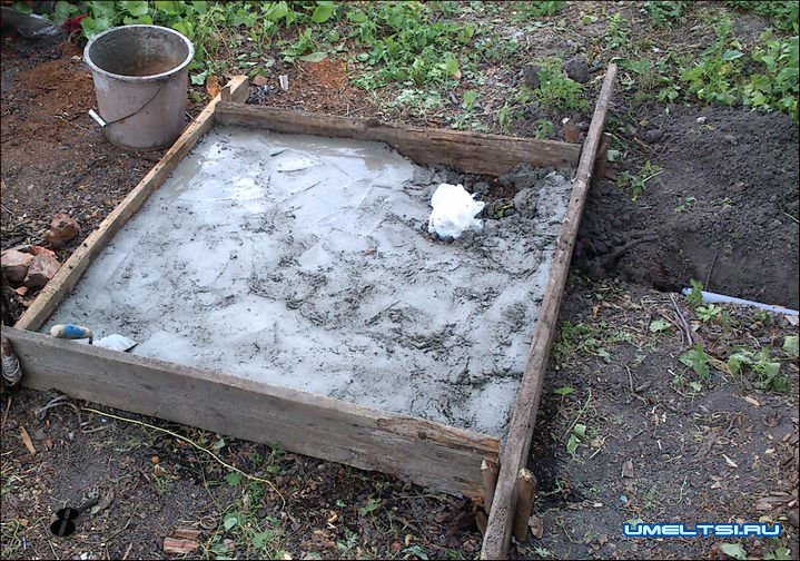 9. При разглаживании бетонной поверхности сделал уклон для стока воды. После застывания бетона разобрал опалубку и прикидал со всех сторон грунтом.