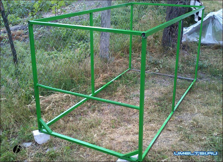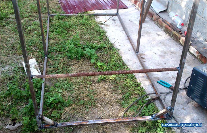 4. Укрепил три стенки попереченками, которые делят прямоугольный куб пополам, это придаст жесткость конструкции и даст возможность прикрепить профнастил. Как вариант такие поперечные трубы можно установить по две на одну сторону, по размеру профлиста.