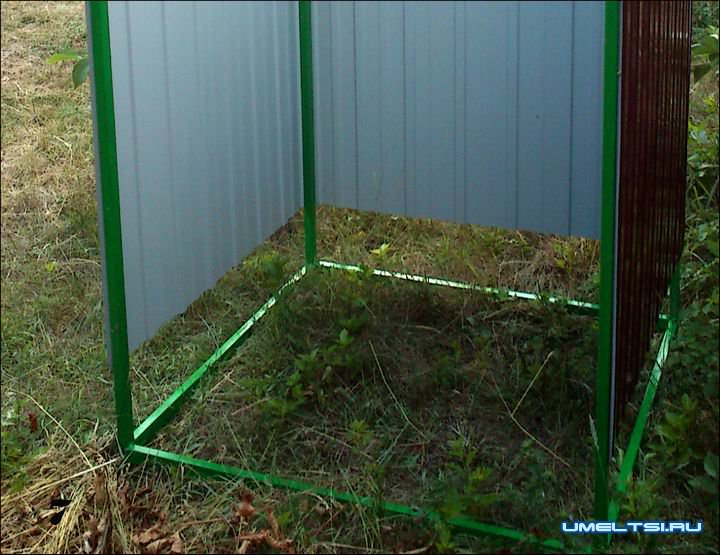 7. Когда краска высохла, саморезами по металлу со сверлом прикрутил профнастил отступив от низа 15 см., создав таким образом три стенки, естественно оставил свободным вход.