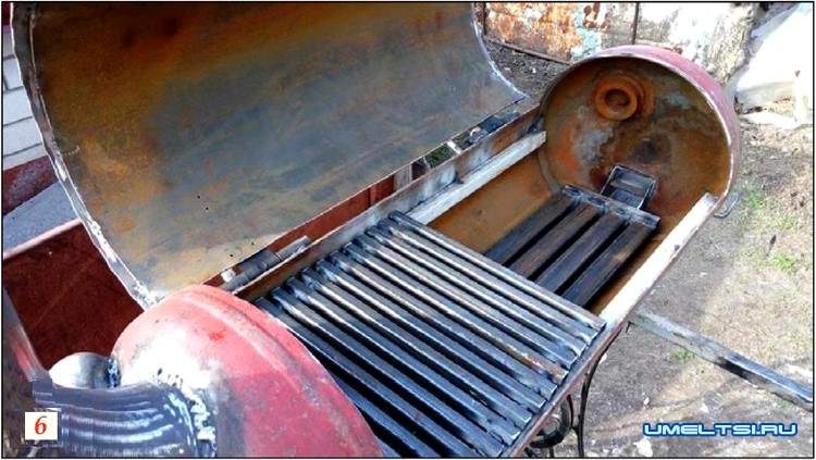 ■ К одному борту мангала, используя петли, прикрепил полукруглые крышки (фото 7), которые изготовил из металлической трубы d 45 см.