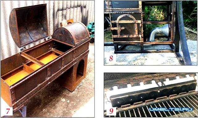 ■ Отдельно собрал шкаф для копчения, установил на него дверцу и дополнил накладками из декоративной полосы (фото 6) (можно изготовить самостоятельно или заказать в кузнечной мастерской). Сверху установил трубу с заслонкой для регулировки тяги. Загрунтовал и покрасил короб термостойким покрытием.