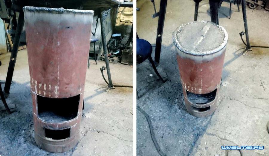 Нужно взять баллон, вырезать отверстия для топки и под зольник, установить колосники. Верхнюю часть нужно срезать и туда же приварить ровную горизонтальную площадку для размещения чайника или сковородки.