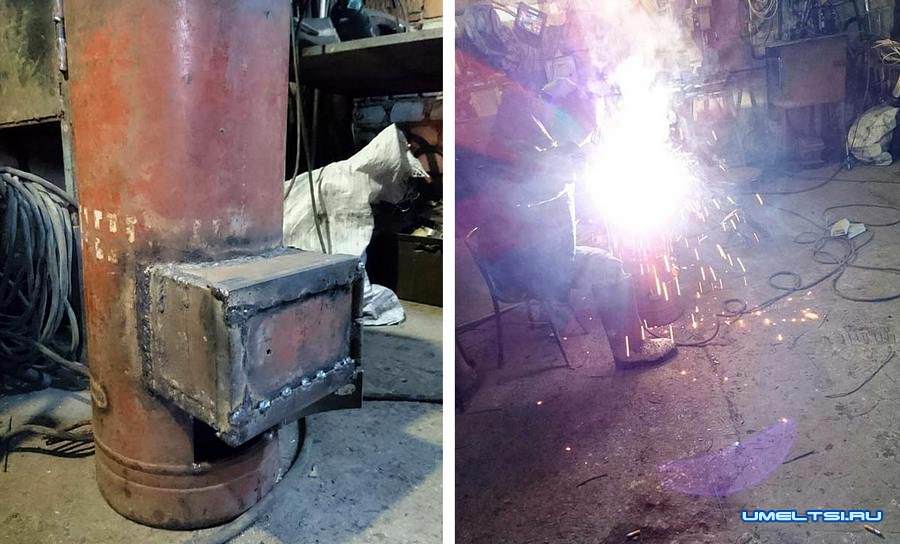 Для увеличения объема топки и для возможности бросать длинные дрова привариваем к баллону короб.