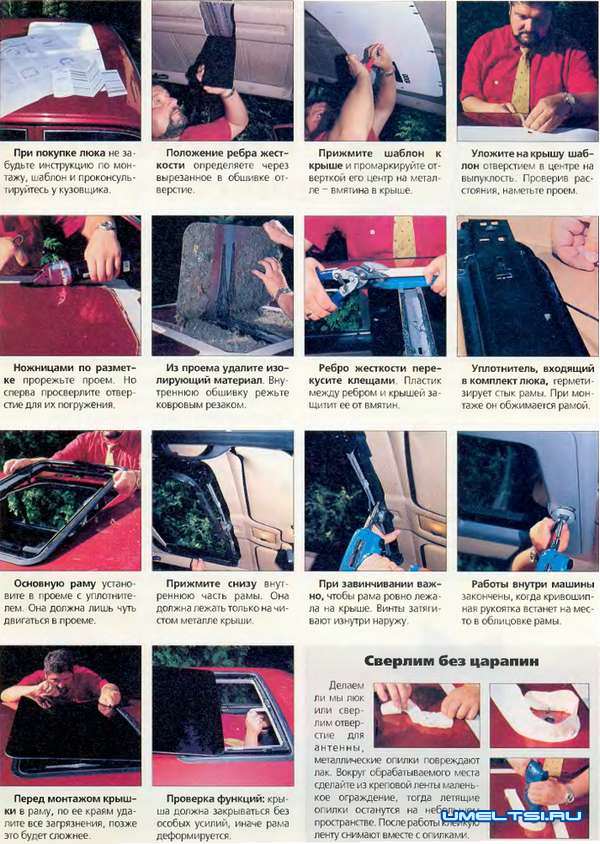 Но вначале точно определяют положение люка. Для этого кладут шаблон на нужное место и «Железное Правило» — 20 см от лобового стекла. Легким надавливанием пальцев сверху можно определить, где проходят под листом поперечные ребра жесткости. Их предстоит разъединить. Осторожно: не надрезать!