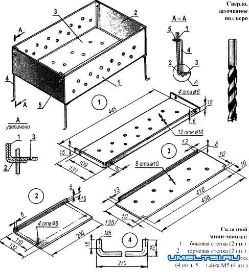 Этот складной мангал запросто сделать самому. Для этого необходимо купить листовую сталь (кровельную) толщиной от 0,8 до 1,5 мм—для создания стенок и днища мангала, металлический пруток (рекомендуется диаметром 5 мм) для ножек и, напоследок, четыре гайки М5.