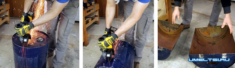 За основу мангала использовал бочку от подсолнечного масла. Разрезал ее болгаркой на две одинаковых половины (фото 1).
