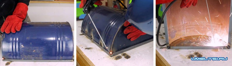 Аналогично окаймил вторую половину бочки (для крышки гриля использовал часть с наливным отверстием). Чтобы не прожечь тонкий металл и конструкцию не повело, по периметру емкость прихватывал к раме в нескольких точках.
