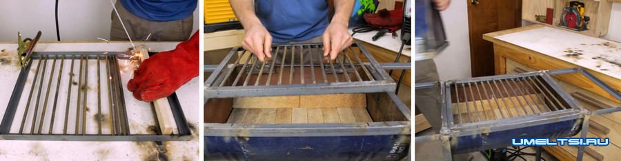 Затем сварил рамку решетки, она будет находиться внутри бортов мангала, должны быть небольшие зазоры. Решетку для садового гриля нарезал из металлического прутка 8 мм (фото 6). К готовой нижней части мангала закрепил крышку, приварив шаровые петли.